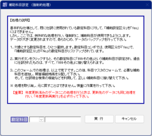 1.補助科目設定(強制的処理)のフォームで、初めて補助科目を設定したい勘定科目を、コンボボックスから選択して、「実行」ボタンをクリックします。他にも初めて補助科目を設定したい勘定科目があるなら、同じ操作を繰り返します。